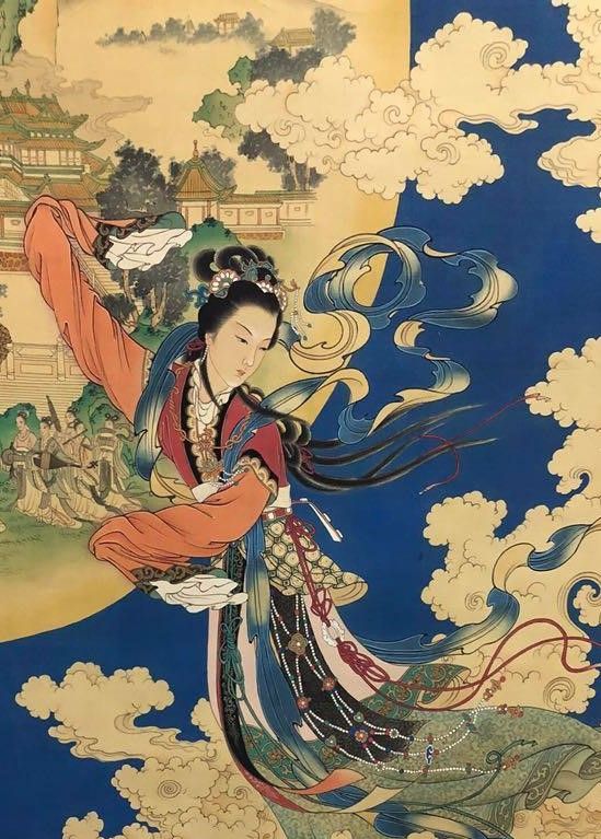 一天,后羿到昆仑山访友求道,向王母求得一包不死药。据说,服下此药,能即刻升天成仙。然而,后羿舍不得撇下妻子,暂时把不死药交给嫦娥珍藏。嫦娥将药藏进梳妆台的百宝匣。三天后,后羿率众徒外出狩猎,心怀鬼胎的蓬蒙假装生病,没有外出。待后羿率众人走后不久,蓬蒙持剑闯入内宅后院,威逼嫦娥交出不死药。嫦娥知道自己不是蓬蒙的对手,危急之时她转身打开百宝匣,拿出不死药一口吞了下去。嫦娥吞下药,身子立时飘离地面、冲出窗口,向天上飞去。由于嫦娥牵挂着丈夫,便飞落到离人间最近的月亮上成了仙。