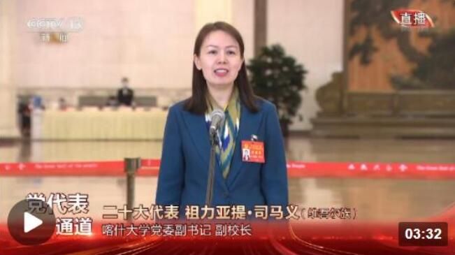 二十大代表 喀什大学党委副书记 副校长 祖力亚提·司马义:不久前我刚从日内瓦回来,以中国学者的身份参加联合国人权理事会,讲述这些年新疆的变化,过去的十年我们新疆地区年生产总值翻了一番,人均可支配收入翻了一番多,都创历史新高。新疆各族群众平等地享有安全、稳定、发展和进步的幸福生活。